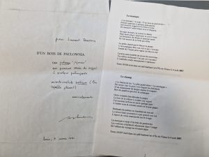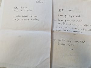 Les documents ajoutés au fonds permettent de rendre compte de l’évolution de la poésie de Serge au cours des années, notamment son intérêt pour la poésie internationale : par exemple, on remarque qu’il s’est fasciné pour la poésie japonaise à la fin de sa vie, comme le montre le poème sans-titre ci-dessous, dédié à Véronique Brindeau. Fascination qui a marqué son entourage : le poète Laurent Desvoux-d’Yrek a écrit en 2007 un recueil en hommage à Serge Brindeau constitué à partir de « palimpsestes » de son recueil de haïkus D’un Bois de Paulownia (1990), disponible à la BUA.